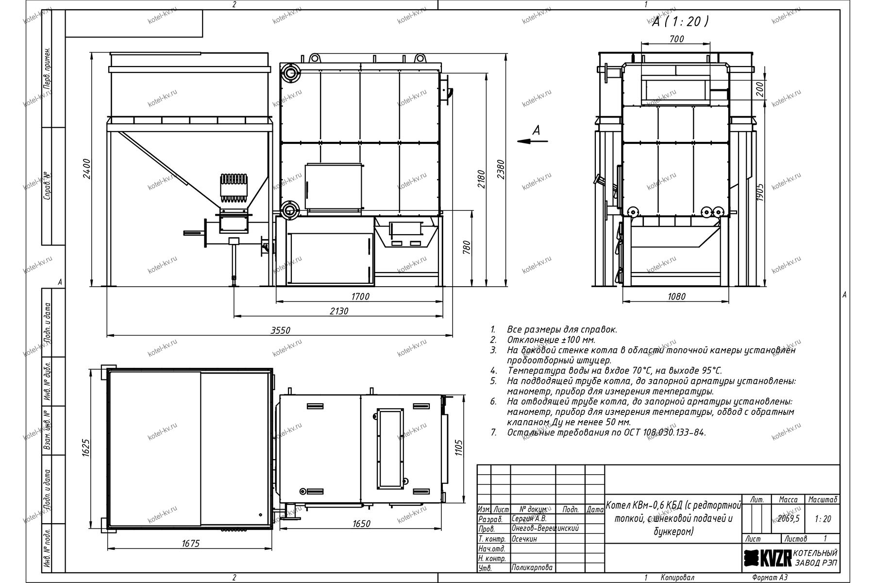 Угольный котел 0.6 МВт с автоматической подачей конструктивно состоит из следующих блоков: